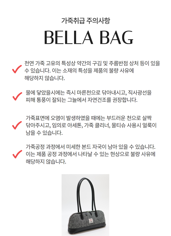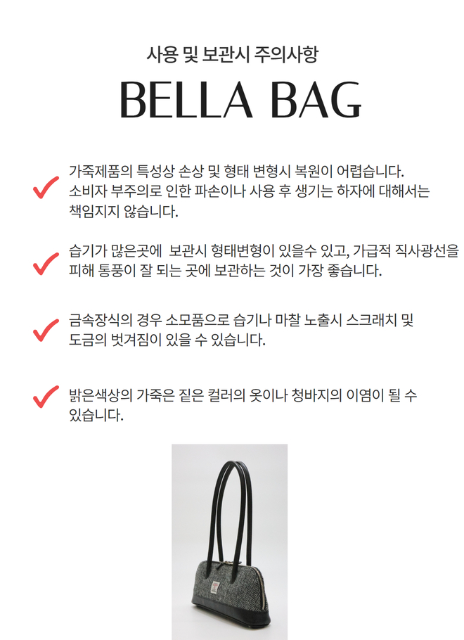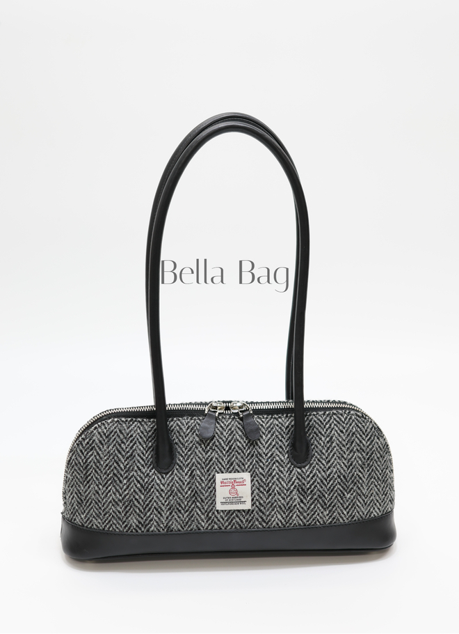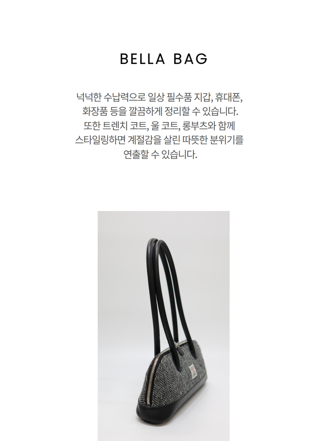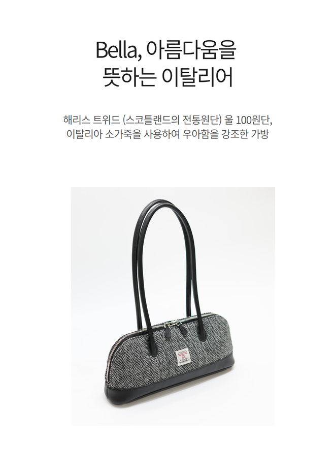 해리스 트위드(스코틀랜드의 전통원단) 울 100원단 + 이탈리아 소가죽을 사용하여 우아함을 강조한 가방입니다.